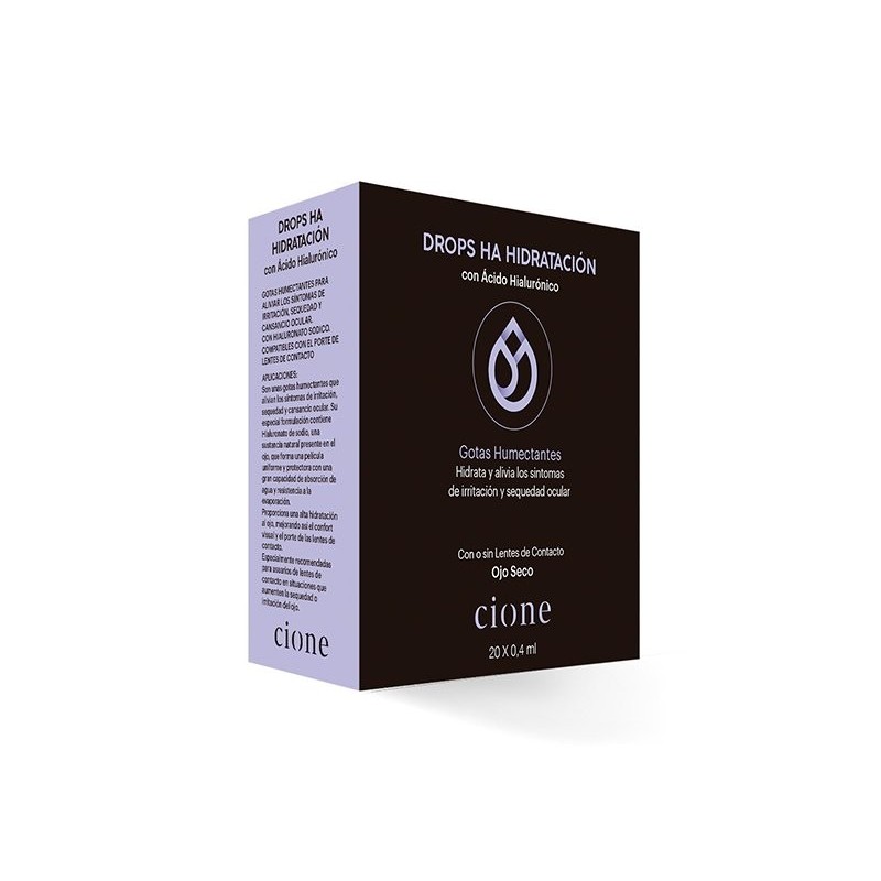 Los Drops HA Hidratación de Cione son gotas humectantes con ácido hialurónico especialmente formuladas para hidratar, refrescar y aliviar la sequedad ocular causada por el uso prolongado de lentes de contacto o factores ambientales como pantallas, aire acondicionado o viento.